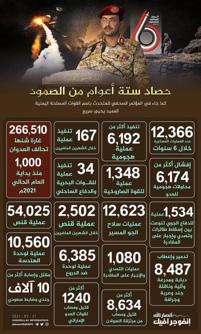 أبرز ماجاء في المؤتمر الصحافي للمتحدث باسم القوات اليمينة العميد يحيى سريع يعرض فيه ابرز الانجازات ضد قوى العدوان، وحصاد ست سنوات من الصمود في وجه العدوان السعودي الأمريكي.