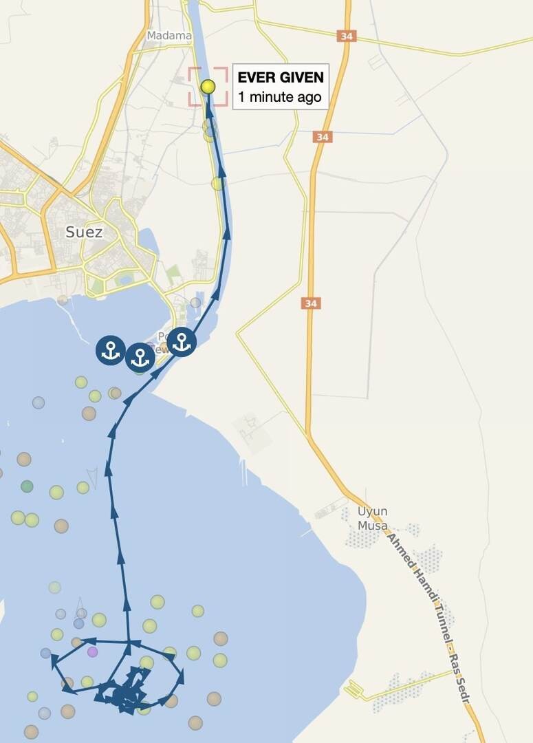 ويظهر من الصور أن السفينة الجانحة سلكت مسارا دائريا وغير مفهوم، قبل أن تدخل ممر القناة.
