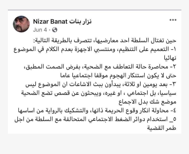 وكتب حينها في المنشور الذي نشره الشهر الجاري: "حين تغتال السلطة أحد معارضيها، تتصرف بالطريقة التالية: التعميم على التنظيم، ومنتسبي الأجهزة بعدم الكلام في الموضوع نهائيا، ومحاصرة حالة التعاطف مع الضحية، بفرض الصمت المطبق، حتى لا يكون استنكار الهجوم موقفا اجتماعيا عاما".