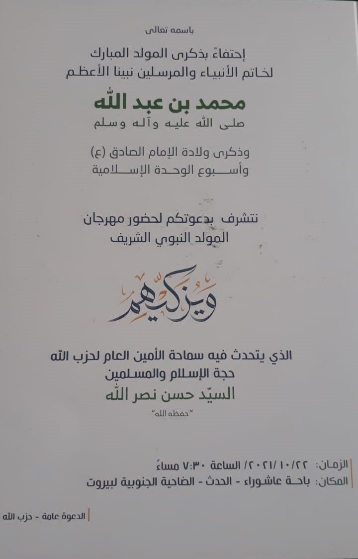 يتحدث الأمين العام لحزب الله سماحة السيد حسن نصرالله في المهرجان الذي يقيمه حزب الله بمناسبة ذكرى المولد النبوي المبارك وأسبوع الوحدة الإسلامية، عند الساعة السابعة والنصف من مساء اليوم الجمعة، في باحة