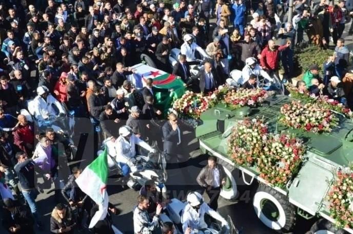 وكانت حشود جماهيرية غفيرة من مختلف الأعمار رافقت جثمان الفريق أحمد قايد صالح، إلى مثواه الاخير بمقبرة العالية في العاصمة الجزائرية، بعدما توفي صباح الاثنين الماضي إثر تعرضه لنوبة قلبية بمنزله عن عمر ناهز 80 عاما.
