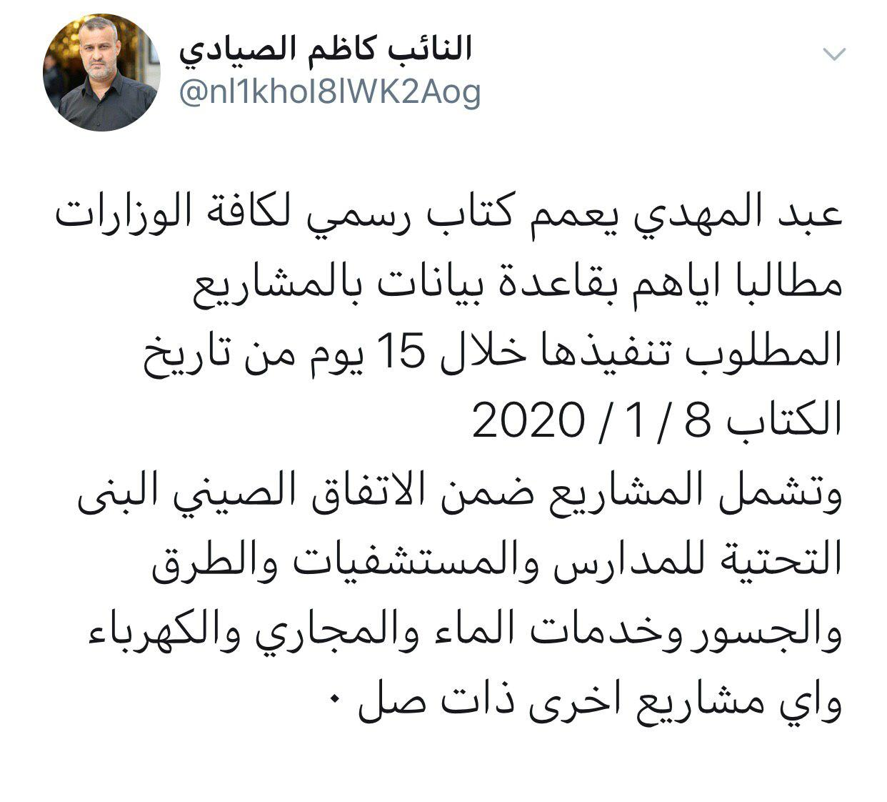 في تحدٍ لأمريكا,عمّم رئيس الوزراء العراقي السيد عادل عبد المهدي كتابًا رسميًا يوم أمس الأول الثلاثاء ٧/١/٢٠٢٠ إلى جميع الوزارات لتزويده ببيانات المشاريع المطلوب تنفيذها في إطار الاتفاق الصيني العراقي، وأمهلهم مدة 15 يومًا لإنجاز المطلوب.