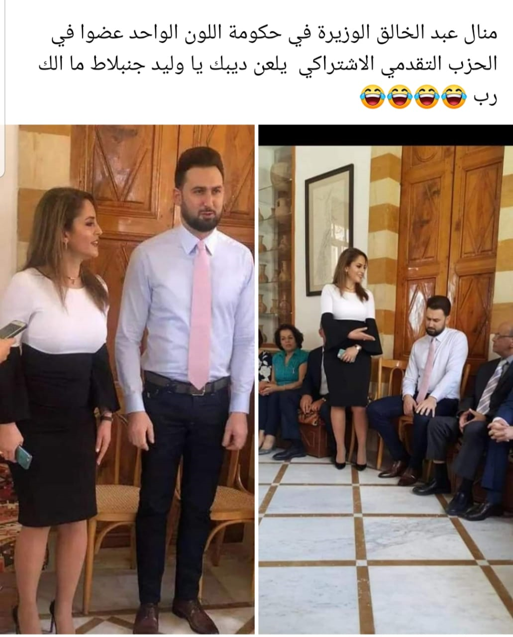 سربت صورة لوزيرة الإعلام ,منال عبد الخالق وهي تظهر بجانب تيموز ابن وليد جنبلاط بوقت أعلن فيه أن وليد جنبلاط وبقية أطراف 14 آذار أنهم خارج حكومة حسان دياب.