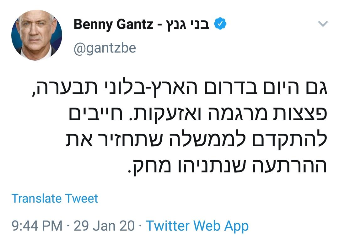 زعيم حزب أزرق أبيض ورئيس هيئة اركان الجيش الصهيوني السابق بيني غانتس : حتى اليوم في جنوب البلاد بالونات حارقة وقذائف الهاون وصفارات الإنذار، يجب على الحكومة المضي قدما لاستعادة الردع الذي تم محوه من قبل نتنياهو ?♂