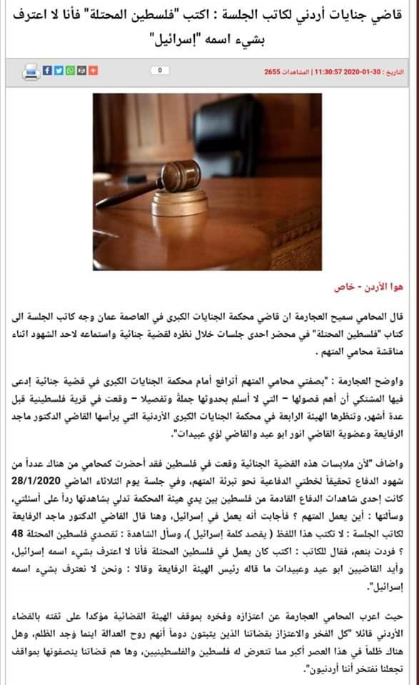 في صفعة هامة لإتفاقية وادي عربة’ قاضٍ أردنيّ برفض كتابة اسم "اسرائيل" في محضر المحكمة