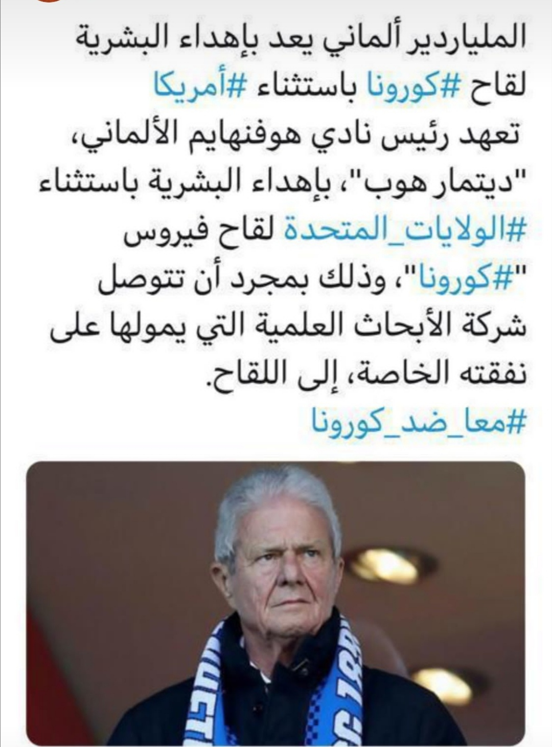 تعهد الملياردير الألماني, ديتمار هوب, باهداء العالم باستثناء الولايات المتحدة بإهداء لقاح ضد فيروس كورونا حال انجازه, لقد تحولت أمريكا لعبئ على البشرية , تنشر شرورها في أربع جهات الأرض