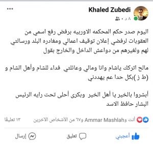 رفضت محكمة أوربية رفع اسم رجل الأعمال السوري خالد زبيدي من قائمة المعاقبين، ذلك بحسب ما ذكر زبيدي في منشور عبر حسابه الشخصي في فيسبوك، مبيناً أن صدور حكم المحكمة الأوربية برفض اسمه من العقوبات جاء نتي