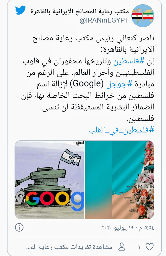 علّق رئیس مکتب رعایة المصالح الإیرانیة فی القاهرة ناصر كنعاني علی قيام غوغل بإزالة خارطة فلسطین من خرائط بحثها.
