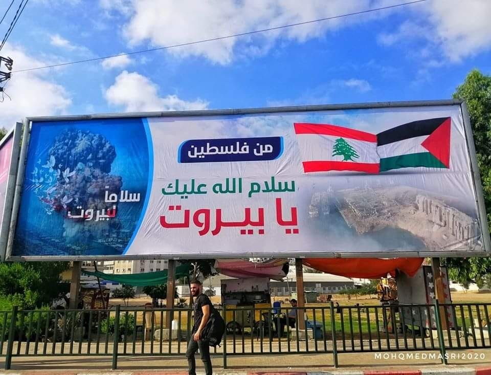 تداول نشطاء عبر مواقع التواصل الاجتماعي، لافتة معلقة في ساحة السرايا وسط مدينة غزة، كتب عليها عبارات تضامنية مع لبنان، وذلك بعد انفجار كبير هز عاصمتها يوم الثلاثاء الماضي، وكتب في اللافتة "من فلسطين.. سلام الله عليك يا بيروت".